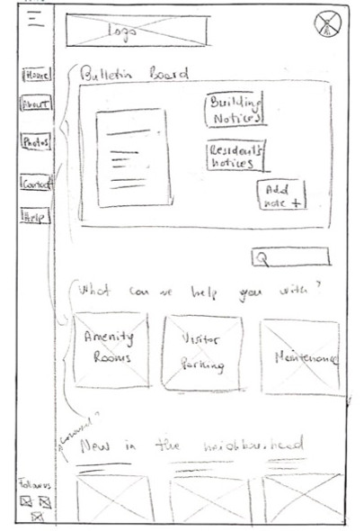 I started off with drawing the paper wireframes of the website homepage. I also designed the paper wireframes for mobile screen sizes to make the website responsive to the different devices that residents will use to access it.